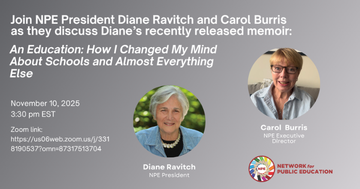 Join NPE President Diane Ravitch as she and Carol Burris discuss her recently released memoir. An Education: How I Changed My Mind About Schools and Almost Everything Else is a beautifully written account of both the personal and professional growth of this hero of public education. This is a discussion you will not want to miss.